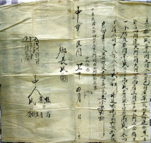 吴宝雨捐赠的档案中,年代最久远的是一张民国7年(1918年)的买卖契约。这张买卖契约用毛笔写在一张薄薄的宣纸上,纸的颜色发黄,折叠处有的已断开,但字迹仍十分清楚。这张契约大意是:成洛业因乏用今将自己村庄窠一段,树木相连,街井一彦,北房四间,连大门筒,大门一盒,西房三间,窗户四个,门二盒,猪圈一个,砖瓦在内卖于成洛且、成洛由,言明价钱叁百壹拾千文。后面还附有“知事会”、“留村田房交易监证人”及“中人”的名字。刘建英介绍,“知事会”等相当于对这一买卖契约的见证人。